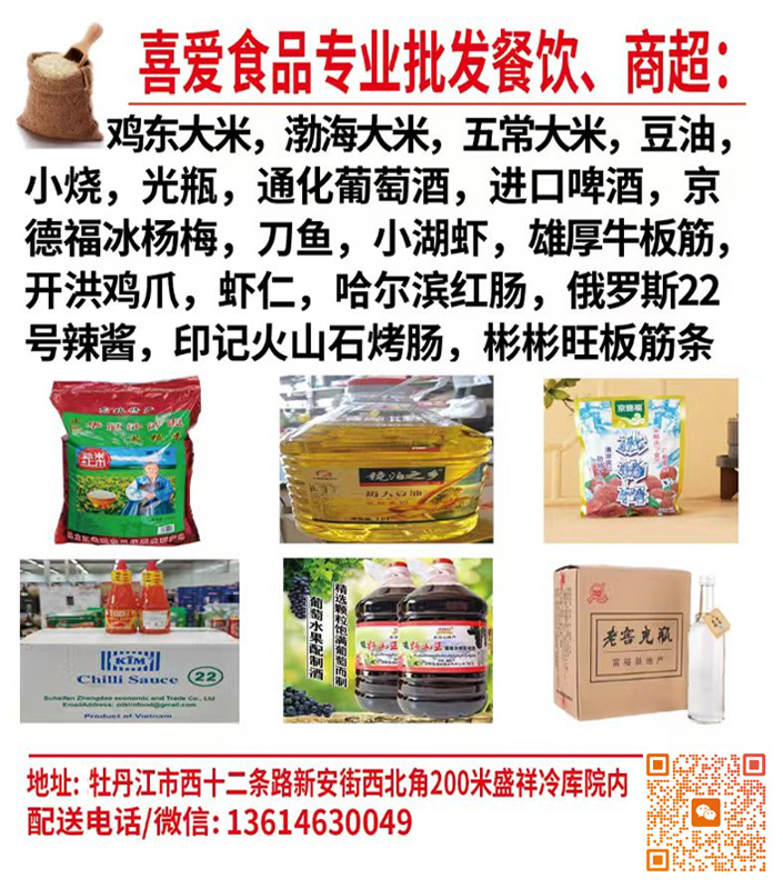喜愛食品專業(yè)批發(fā)飯店/超市:雞東大米,渤海大米,五常大米,鏡泊之鄉(xiāng)大豆油,圣水泉小燒,通化葡萄酒,特價(jià)啤酒,冰楊梅,湖蝦,王牌蝦,蝦仁,俄羅斯辣醬,聯(lián)系電話/微信:13614630049
